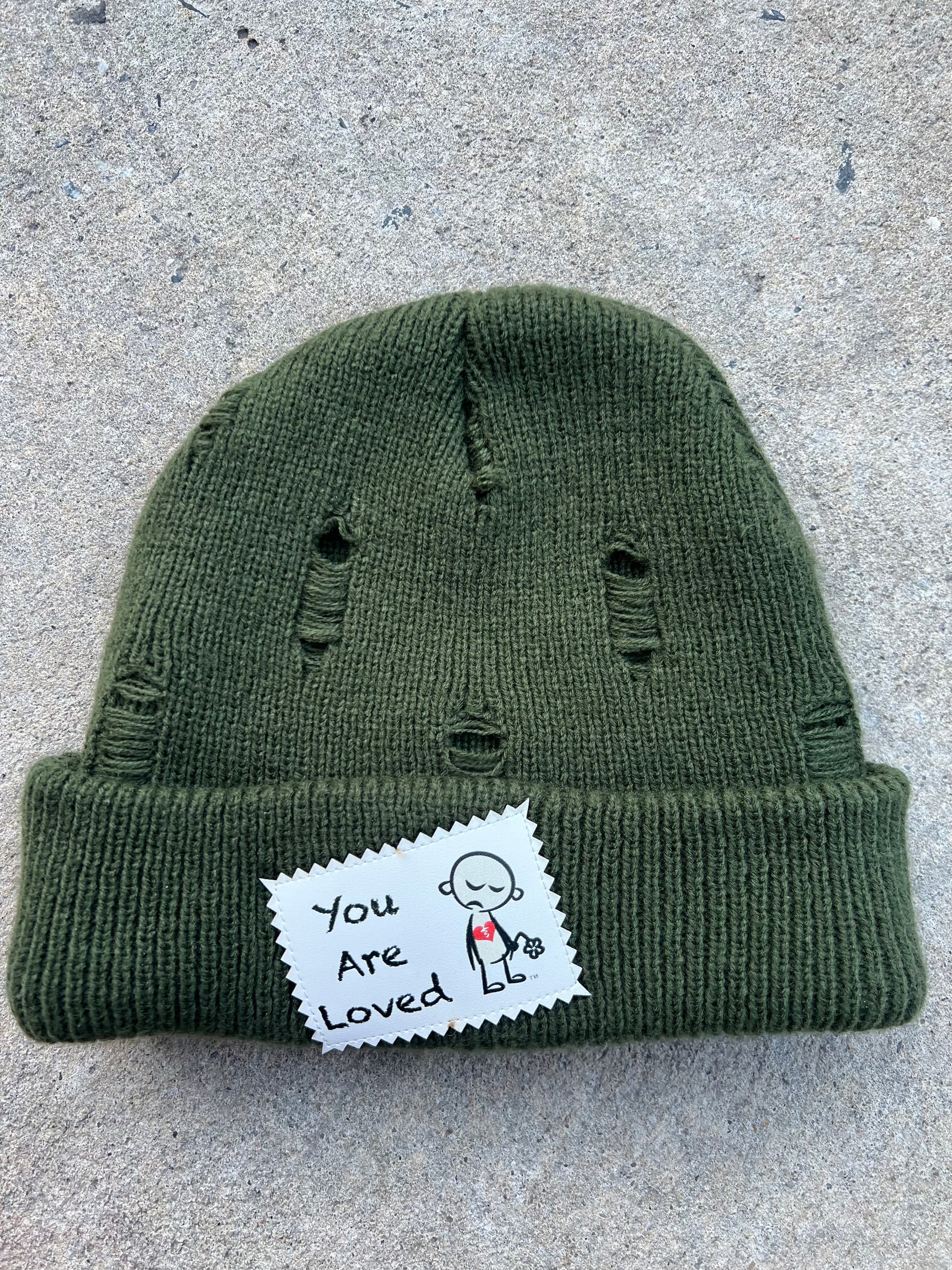 This beanie is a reminder that you are loved through imperfections, mistakes, and every part of your story. The scarred detailing surrounding “You Are Loved” represents the trauma people experience around love. Some beanies feature more visible scars than others, symbolizing that while everyone carries wounds, some are more visible than others. Designed with a heavy, comforting feel, this beanie represents real love, powerful, unconditional, and safe. Material: 100% acrylic